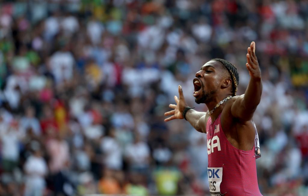 2023年8月20日,美國選手萊爾斯在2023世界田徑錦標賽男子100米決賽后慶祝。新華社記者 李穎 攝