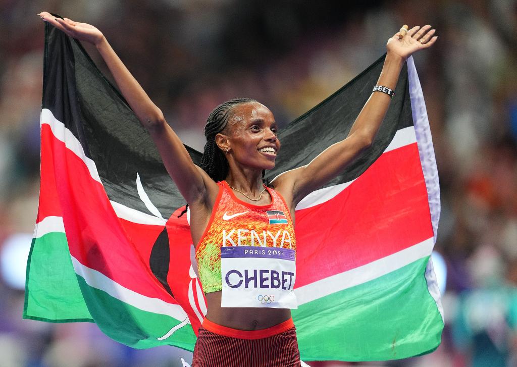 2024年8月9日,巴黎奧運會田徑女子10000米冠軍肯尼亞選手切貝特在比賽后慶祝。新華社記者 許暢 攝