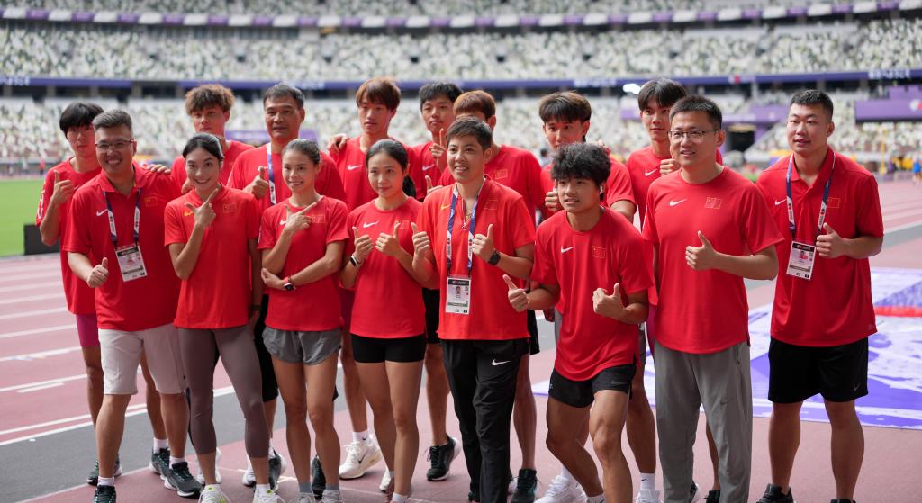 9月12日,中國田徑隊部分成員在比賽場地內合影。新華社記者 李鋼 攝