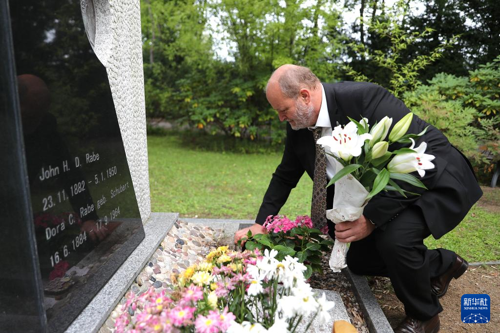 8月7日,國際友人約翰·拉貝的曾外孫克里斯托夫·賴因哈特在德國柏林的拉貝墓前悼念。新華社記者 杜哲宇 攝