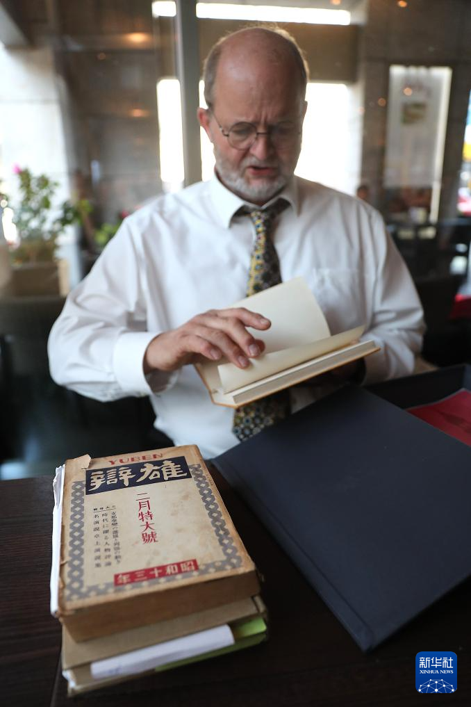 8月7日,在德國柏林,國際友人約翰·拉貝的曾外孫克里斯托夫·賴因哈特展示自己收藏的南京大屠殺歷史資料。新華社記者 杜哲宇 攝