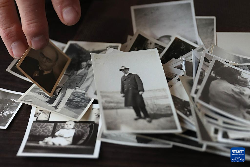 8月7日,在德國柏林,國際友人約翰·拉貝的曾外孫克里斯托夫·賴因哈特展示家族成員的老照片。新華社記者 杜哲宇 攝