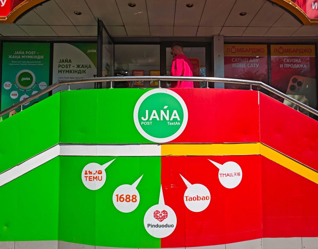 這是9月3日在哈薩克斯坦阿拉木圖一家主要負責中國網購平臺物流服務的快遞網點外拍攝的宣傳標識。新華社記者 李任滋 攝