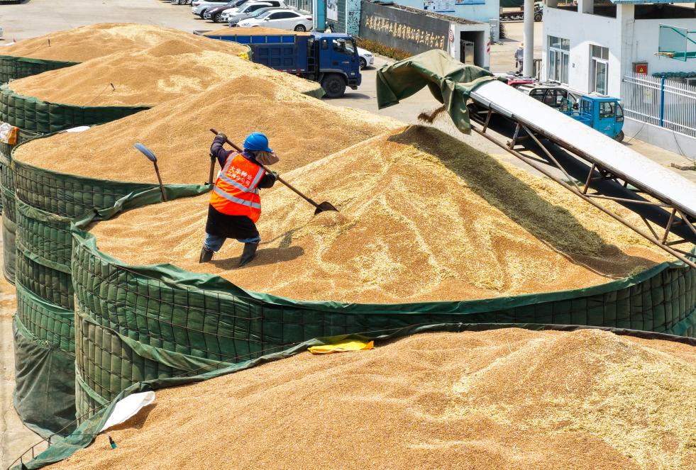 位于江蘇盱眙的江蘇農墾三河農場收獲的小麥進入大華種業三河分公司存儲(5月28日攝,無人機照片)。新華社發(許昌銀攝)