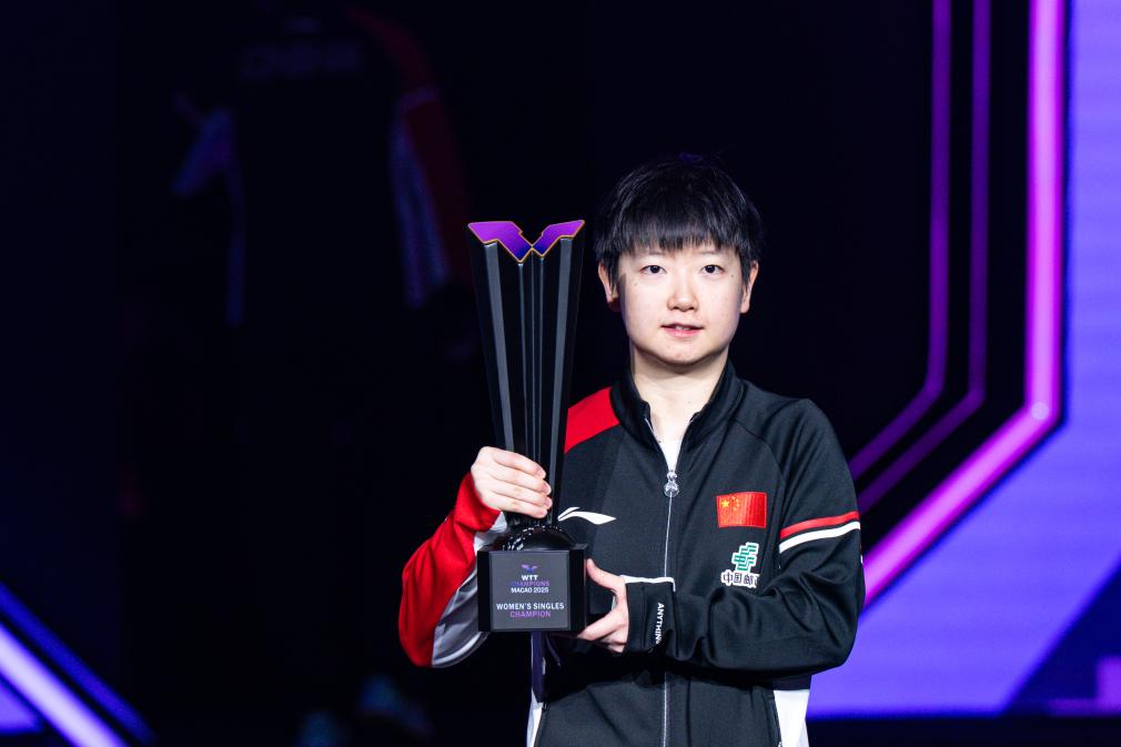 9月14日,冠軍孫穎莎在頒獎儀式上。當日,在澳門進行的2025年世界乒乓球職業大聯盟(WTT)澳門冠軍賽女子單打決賽中,中國選手孫穎莎4比3戰勝隊友王曼昱,奪得冠軍。新華社發(張金加攝)