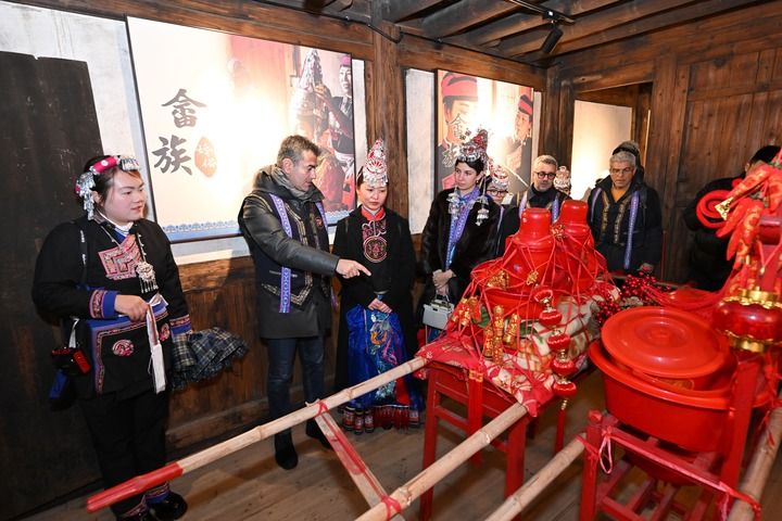 2025年1月20日,意大利客人在霞浦縣半月里村參觀畬族婚俗館。