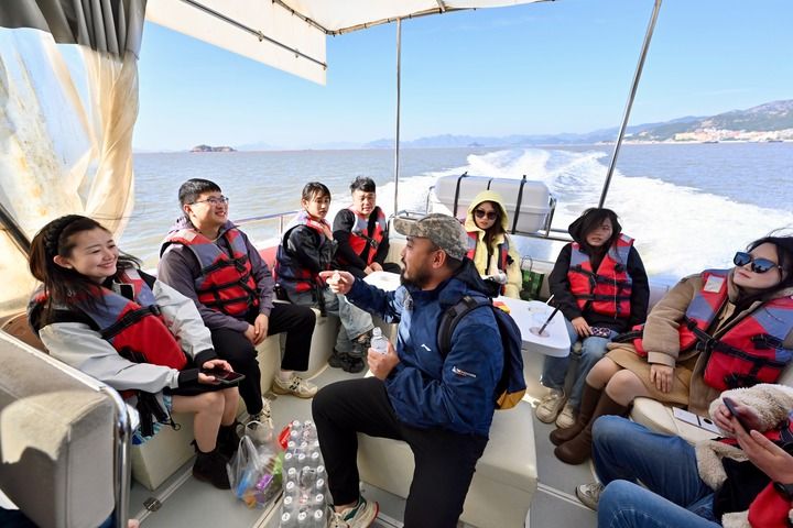 2024年11月29日,霞浦縣旅游業者姜瑜帶領游客乘船海上游覽。