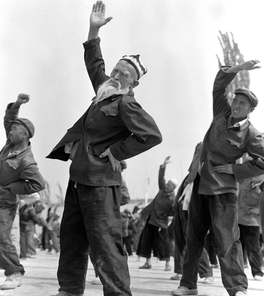在新疆麥蓋提縣,人們在農民運動會上參加廣播體操比賽(1976年5月攝)。