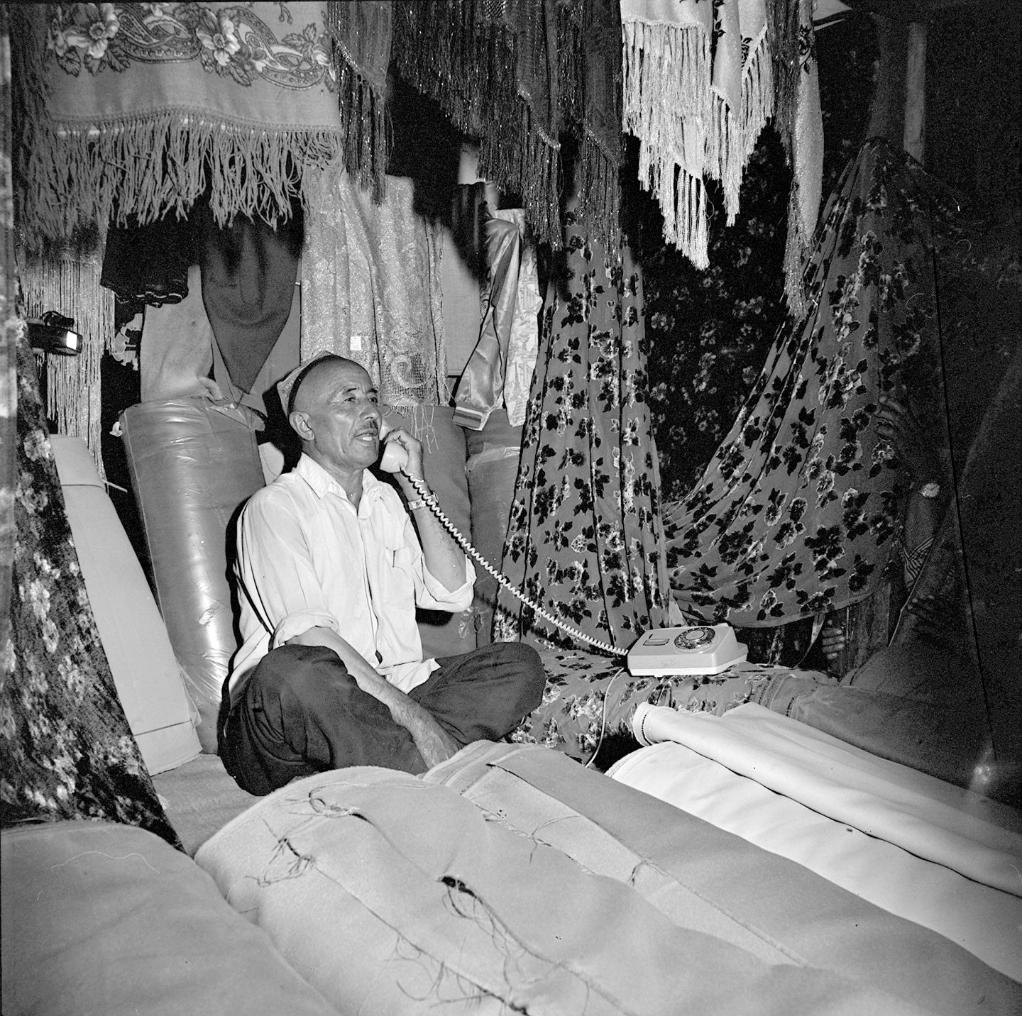 在新疆克孜勒蘇柯爾克孜自治州阿圖什市,農民麻木提用自家的電話組織貨源(1984年11月7日發)。