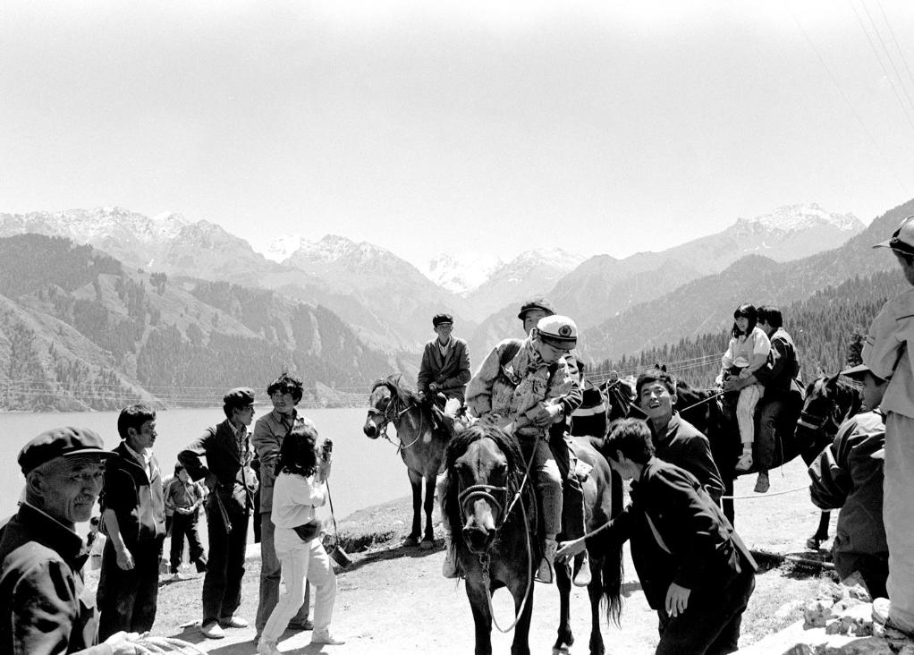 由新疆牧區青年組成的導游隊帶領香港游客騎馬登天池雪山(1988年8月31日發)。