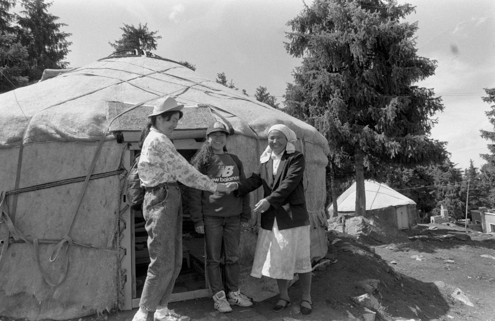 牧民卡斯娜(右)在天山腳下自辦的氈房旅店熱情接待游客(1991年8月6日發)。