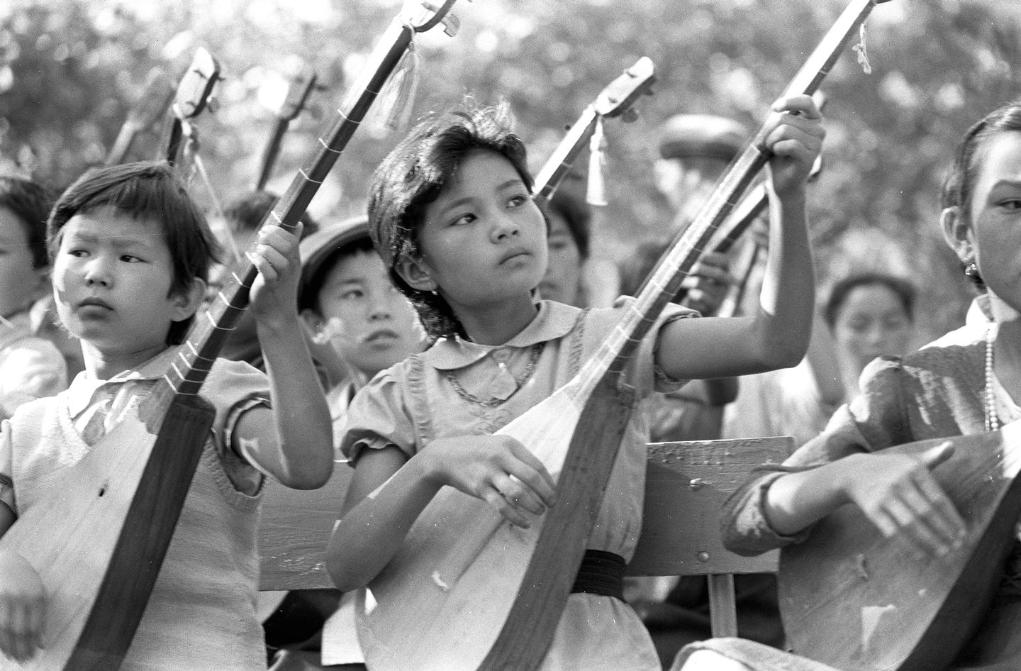新疆新源縣文化館樂器小組的哈薩克族中小學生在演奏樂器(1991年9月28日發)。