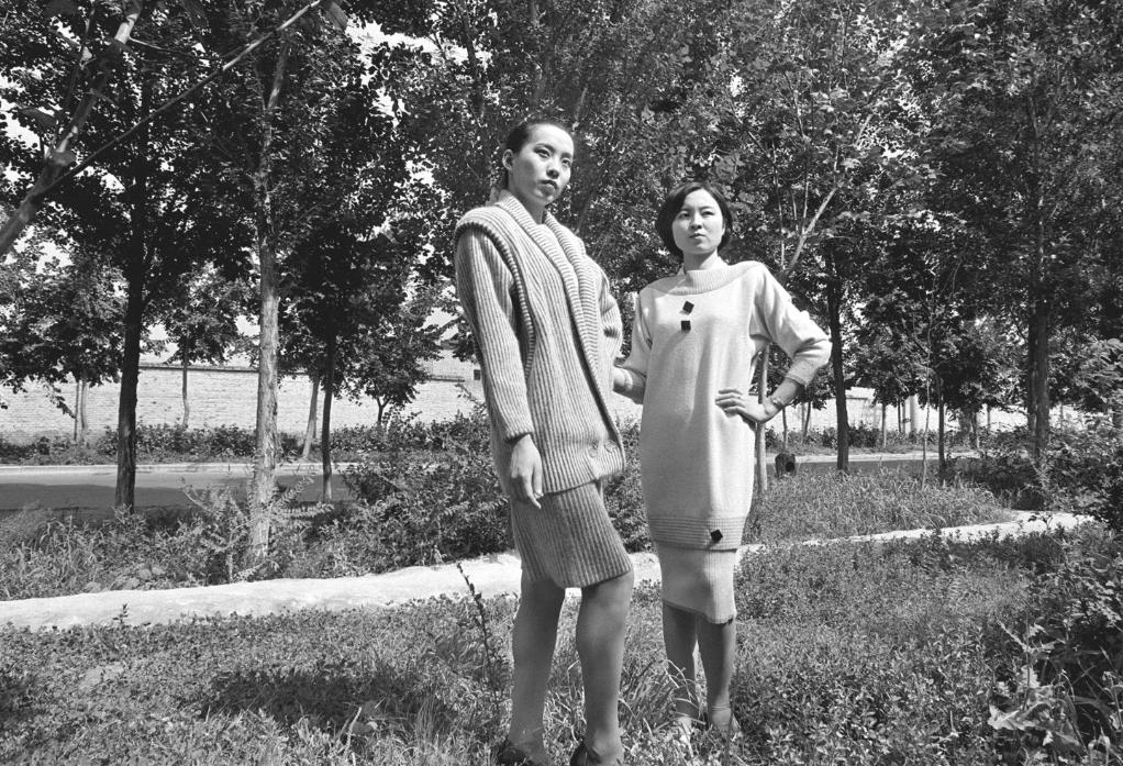 身著“天山”牌毛紡織品的女青年(1989年8月19日發)。