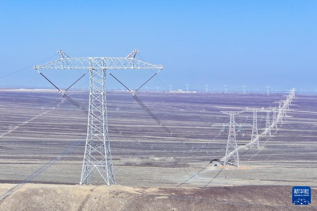矗立在戈壁上的±800千伏哈密—重慶特高壓直流輸電線路工程(4月8日攝,無人機照片)。