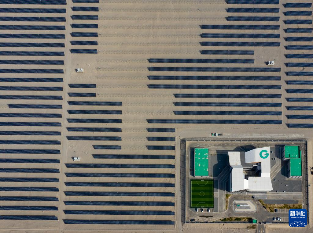 9月22日在新疆巴音郭楞蒙古自治州若羌縣拍攝的中國綠發新疆中綠電若羌400萬千瓦光伏項目(無人機照片)。該項目每年可發電69.08億千瓦時,滿足南疆200萬戶家庭用電需求。