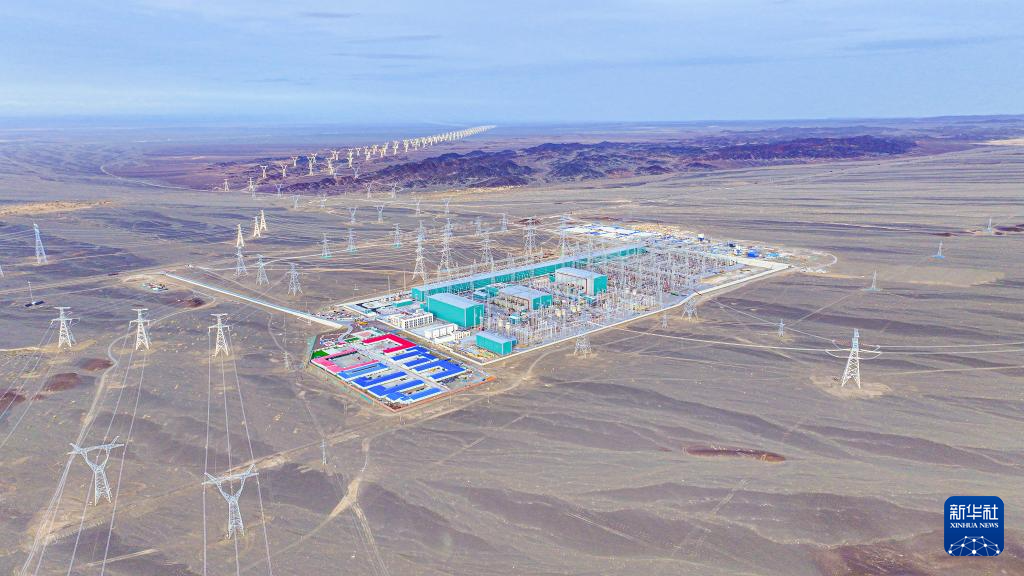 9月22日在新疆巴音郭楞蒙古自治州若羌縣拍攝的三峽集團“疆電外送”第四通道電源項目施工現場(無人機照片)。