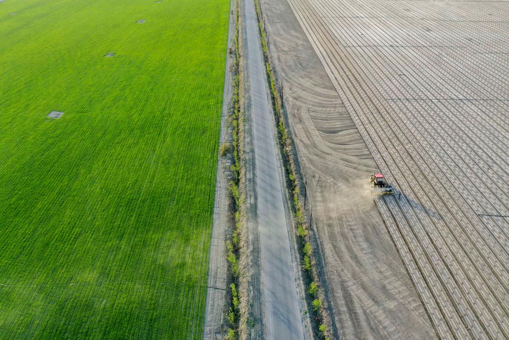 棉農在新疆沙灣市大泉鄉五道河子村的棉田春播,一旁的小麥長勢良好(2022年4月17日攝)。