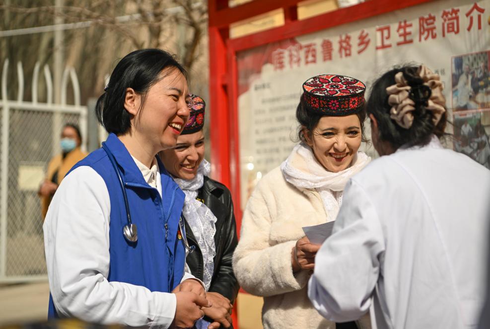 在新疆塔縣庫科西魯格鄉衛生院,深圳援疆新生兒科醫生潘千(左一)與村民、鄉衛生院醫護人員交流(2025年3月24日攝)。