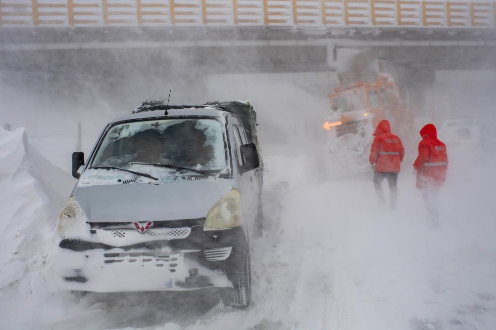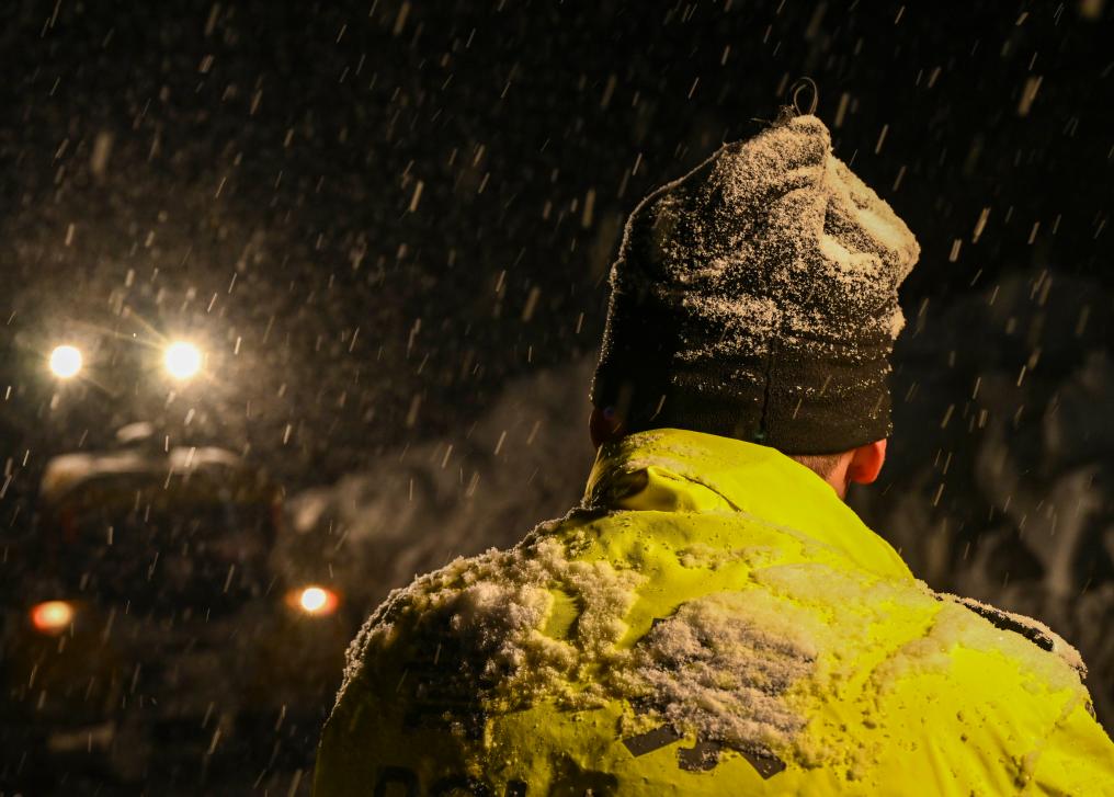 瑪依塔斯防風雪搶險基地的工作人員頂風冒雪搜尋被困旅客(2021年1月23日攝)。