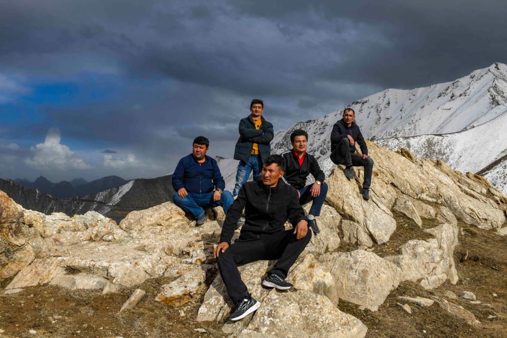 翻越雪山達坂后,參與新疆全民免費體檢服務的部分西合休鄉衛生院醫護人員在山中休息時合影(2020年5月2日攝)。