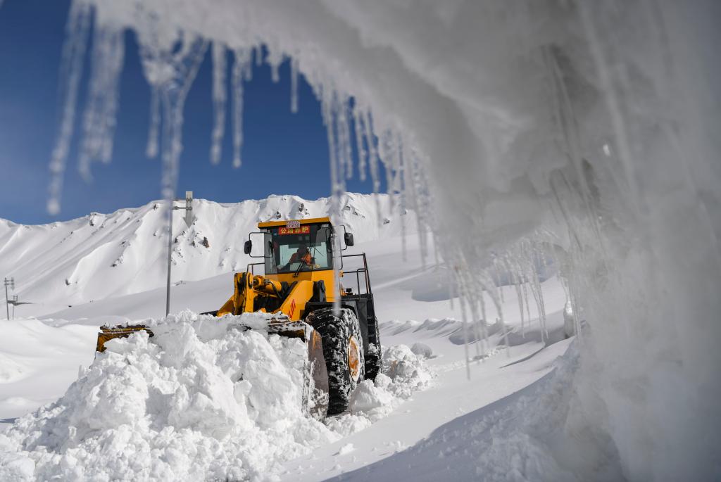 烏蘭薩德克養護站工人烏斯曼·巴克駕駛裝載機在獨庫公路的雪崩多發路段上清雪(2023年5月9日攝)。