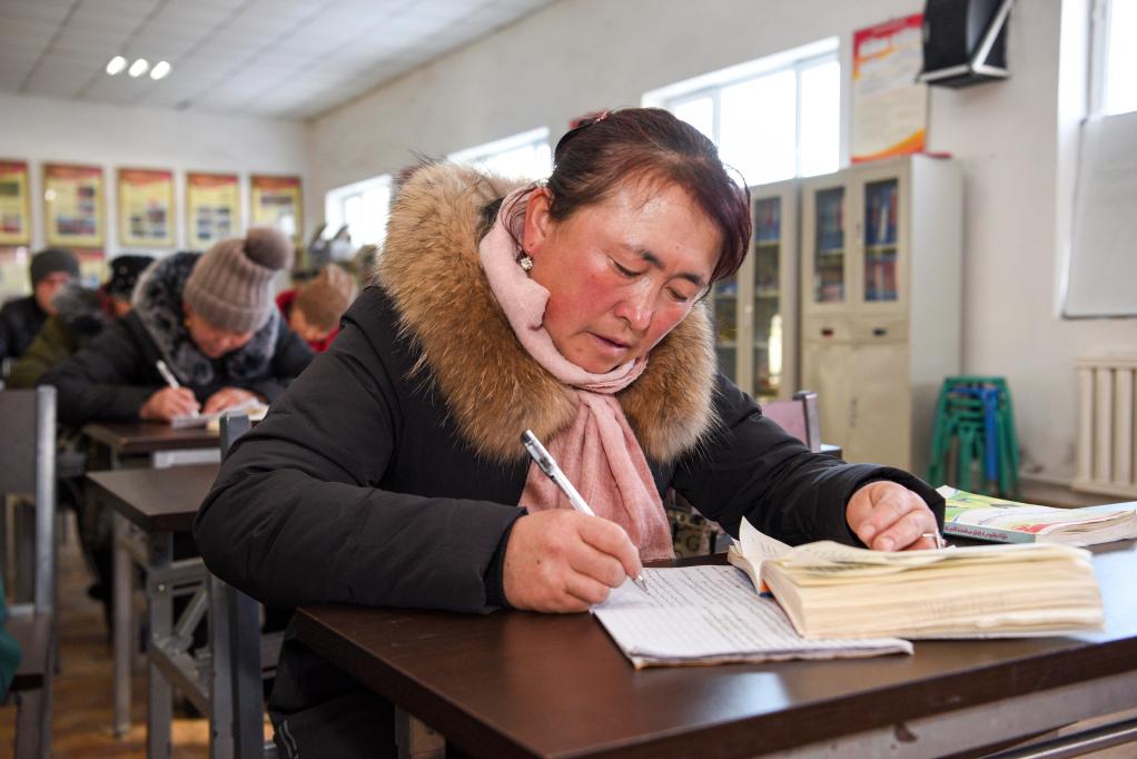 在新疆農業廣播電視學校昭蘇縣分校巴爾格勒津村教學點,42歲的牧民古力巴哈提·斯拉木霍加在復習動物衛生防疫技術課的知識點(2018年1月22日攝)。2019年4月,她和班上的44名同學將拿到畜牧獸醫專業的中專畢業證,有望得到新的就業機會。