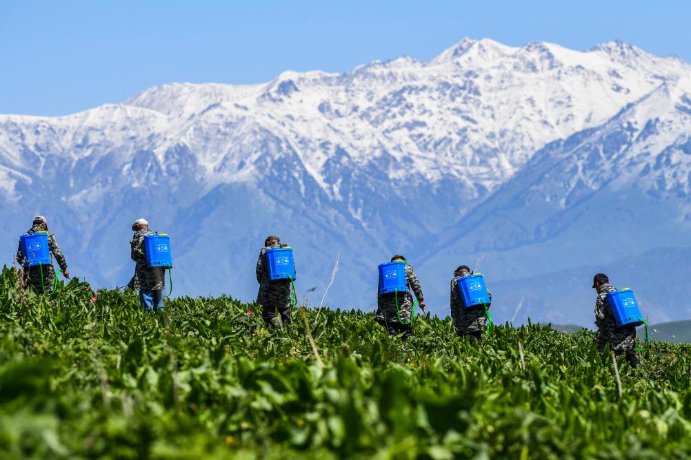 新疆新源縣別斯托別鄉恰普河加嘠村村民在那拉提草原深處噴灑除毒害草藥劑(2018年5月26日攝)。