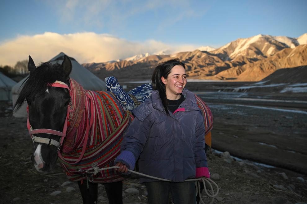這是在新疆塔縣塔什庫爾干鄉薩熱吉勒尕村拍攝的馴馬中的古麗艾薩·迪汗(2025年3月21日攝)。她是全縣首位參加5000米速度賽馬的女騎手。