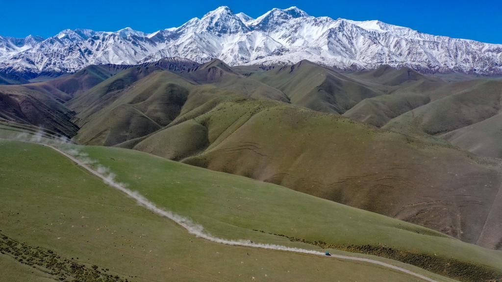 汽車疾馳在位于昆侖山北麓的新疆策勒縣一處高山牧場道路上(2019年5月31日攝,無人機照片)。近年來,新疆偏遠牧區的出行條件得到改善。