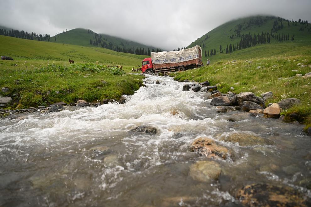 進行機械化轉場的牧民開車行駛在新疆那拉提草原深處(2025年6月11日攝)。