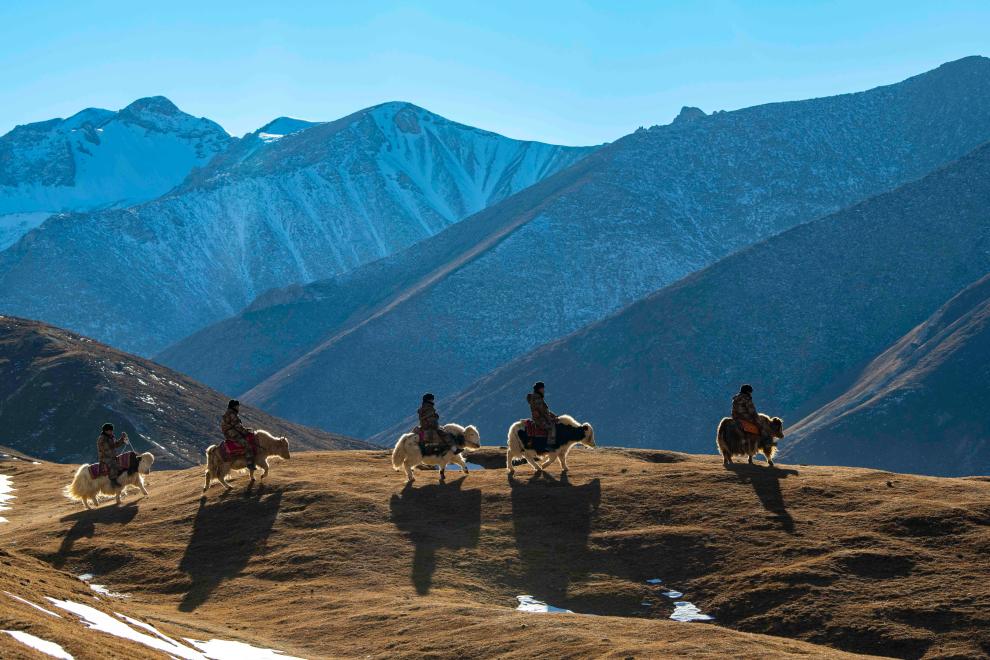 新疆生產建設兵團第三師圖木舒克市葉城二牧場三連的干部職工騎著牦牛行進在巡邊路上(2020年12月25日攝)。