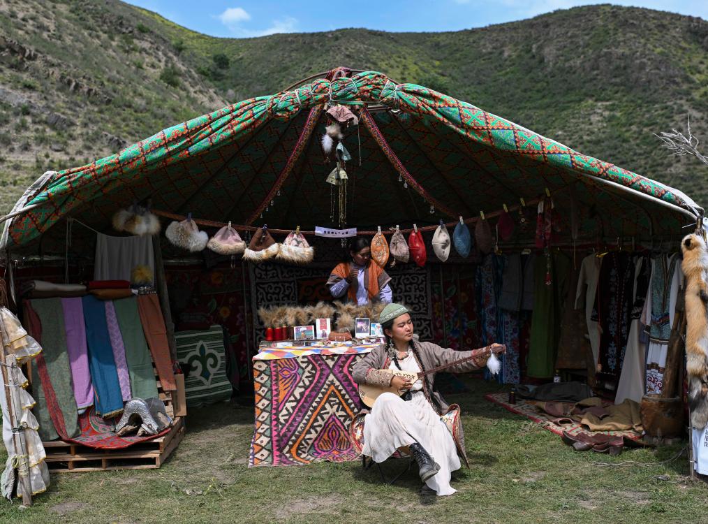 在烏魯木齊市水磨溝區的“夏牧場·游牧文化旅游節”上,北京姑娘周方怡(前)在展廳前彈奏冬不拉,她的“游牧”文創搭檔扎伊拉·也斯達吾列提在身后準備展品(2024年6月15日攝)。