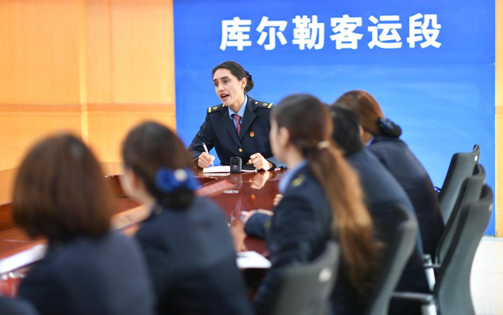 在中國鐵路烏魯木齊局集團有限公司庫爾勒客運段辦公樓,艾爾開牙·多力開帶領同事開展值乘前的業務學習(2025年1月15日攝)。