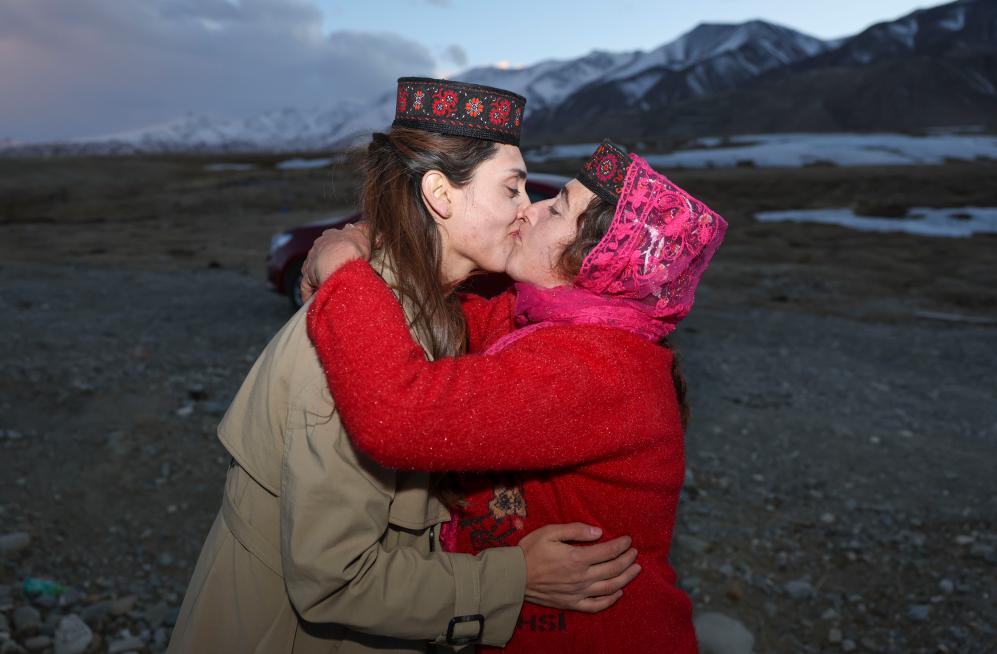 在新疆塔什庫爾干塔吉克自治縣瓦恰鄉夏布孜喀拉村,一位長輩(右)和艾爾開牙·多力開告別(2024年3月22日攝)。