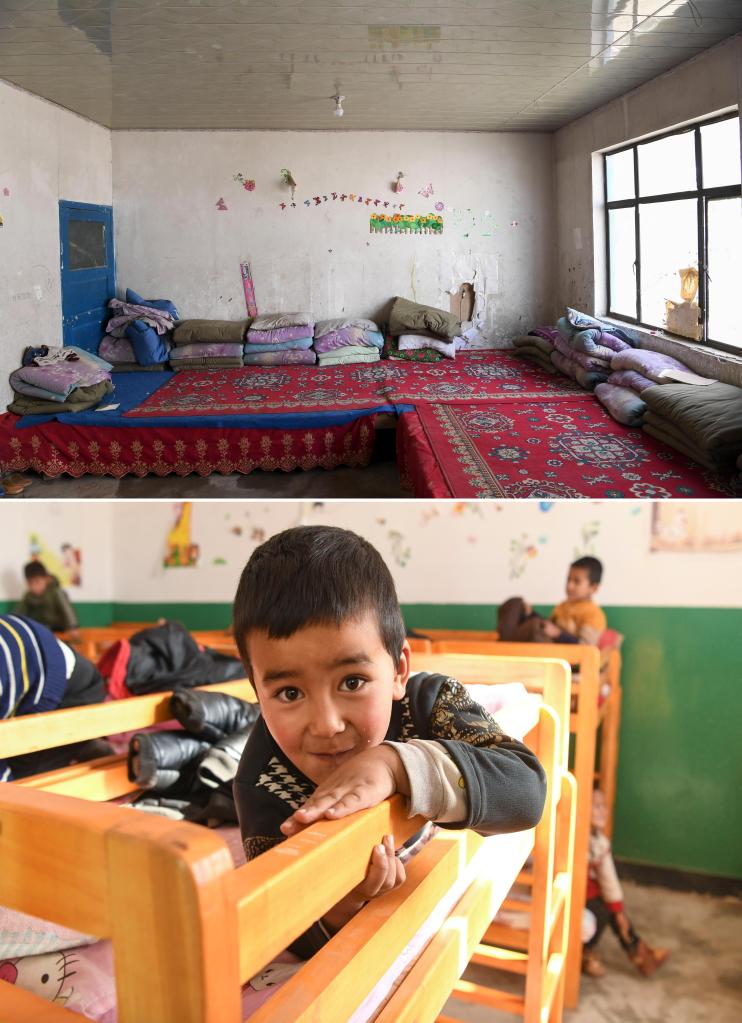 拼版照片:上圖為易地扶貧搬遷前的于田縣達里雅布依鄉學校學生宿舍(2018年9月5日攝);下圖為5歲的阿不都沙拉木·庫爾班在新學校午休(2019年11月19日攝)。