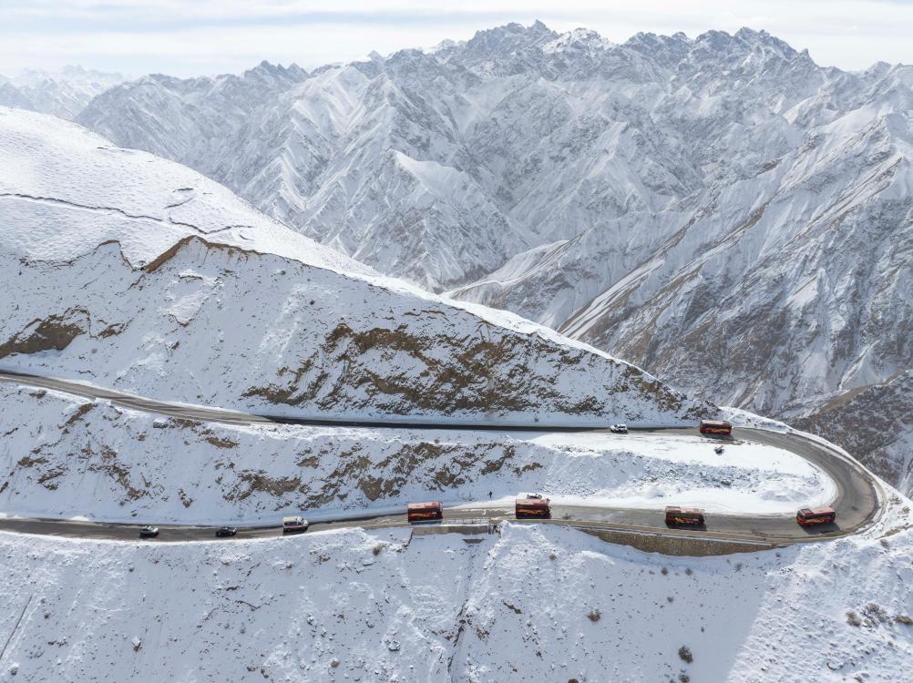 由警車開道、救護車隨行的上學車隊穿行在昆侖山區,帶著西合休鄉的初中生前往縣城上學(2024年2月26日攝)。