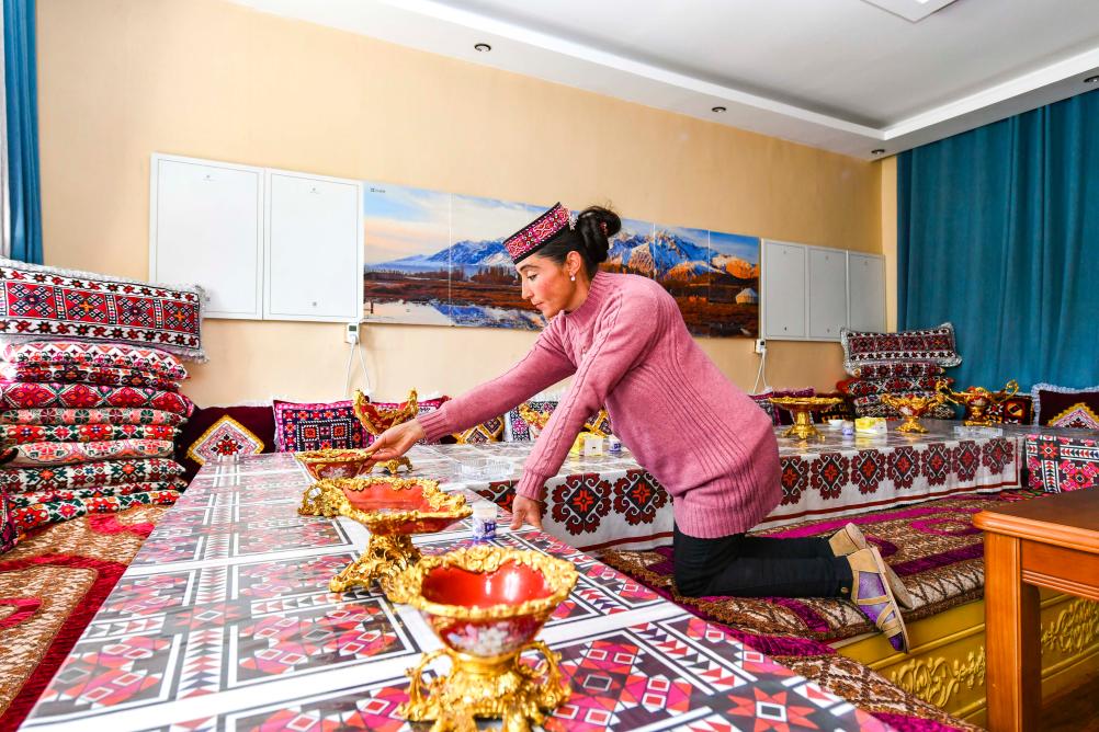 新疆塔什庫爾干塔吉克自治縣塔什庫爾干鄉瓦爾希迭村村民瑪依努爾古麗·依克木在民宿內擺放物品,準備招待游客(2020年6月4日攝)。