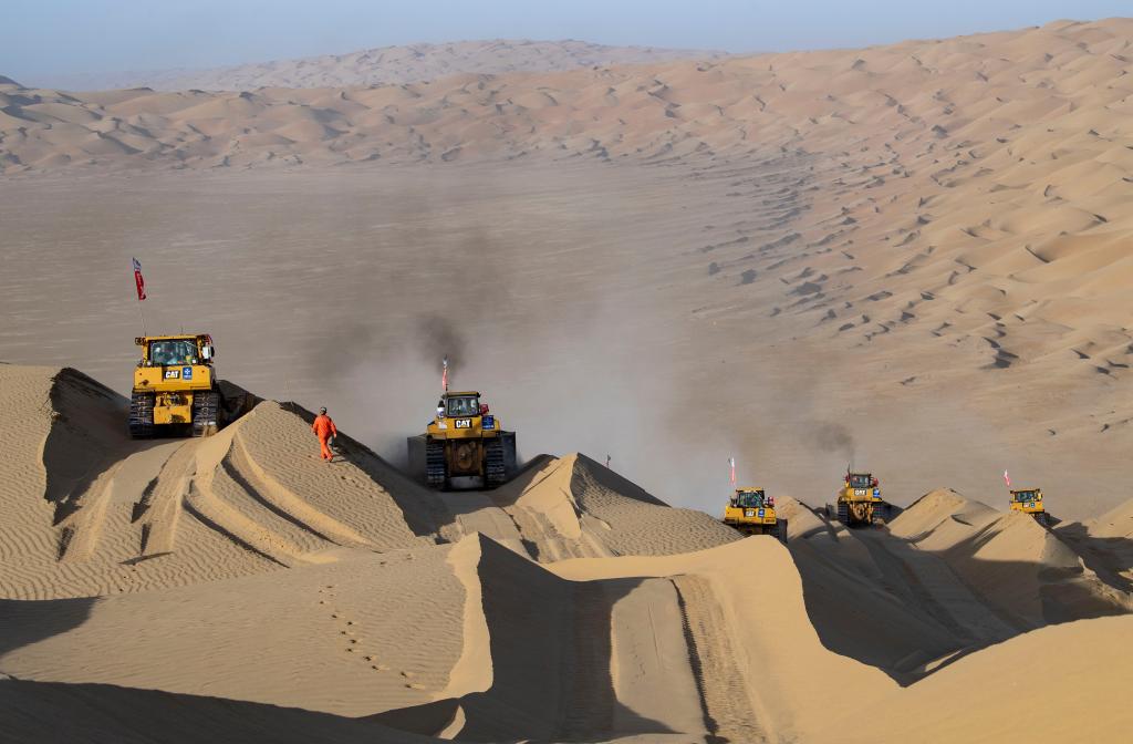 在新疆尉犁至且末沙漠公路建設現場,工人李明友爬過沙丘觀察推土機作業進展(2020年5月16日攝)。