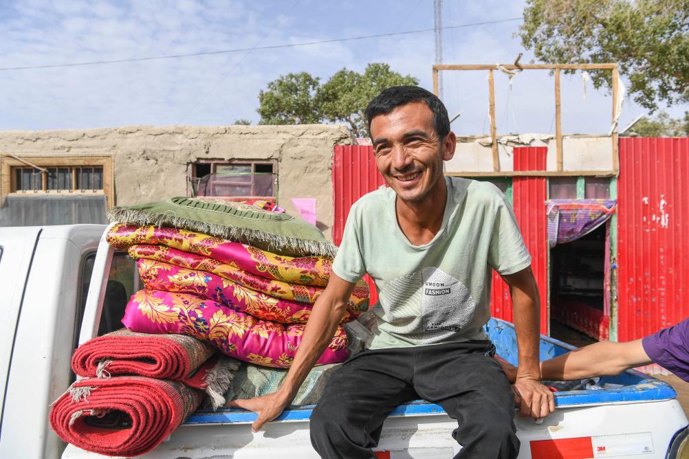 在新疆于田縣達里雅布依鄉政府駐地附近的村莊,村民熱和買提·買買提明在幫助該鄉首批易地搬遷貧困戶轉運行李(2018年9月5日攝)。