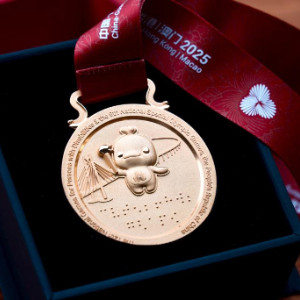 緞帶顏色以“中國紅”為基調,“三花映牡丹”的圖案將牡丹花、木棉、紫荊、蓮花融入其中;懸掛獎牌的掛環采用“同心結”造型,靈感源自港珠澳大橋……這些巧思體現了設計團隊的心意:把粵港澳大灣區的城市標識與中華文化的象征結合,盡顯中式美學的浪漫與韻味。