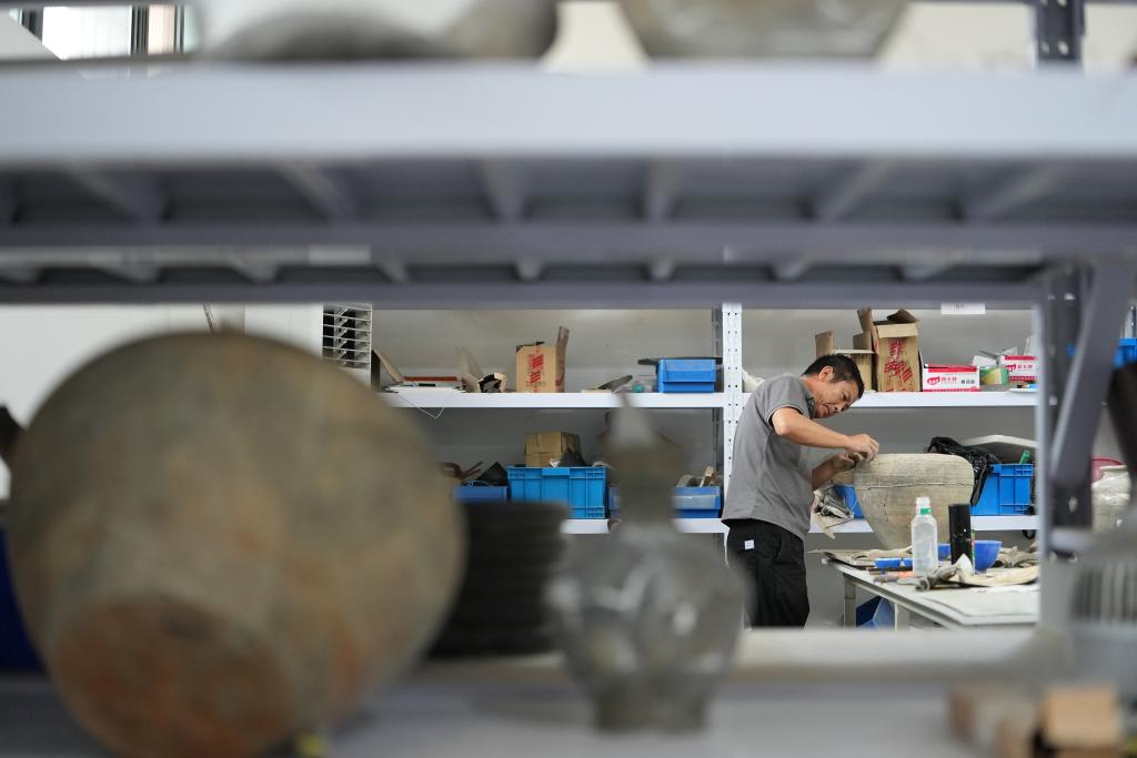 工作人員在陜西省考古研究院秦漢考古基地修復秦咸陽城遺址出土文物。 唐浦萌 攝
