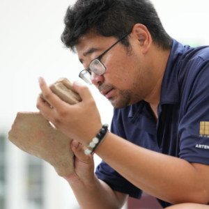 秦咸陽城遺址考古項目負責人、陜西省考古研究院副研究館員張楊力錚仔細觀察考古發掘出的陶片。新華社記者 李一博 攝
