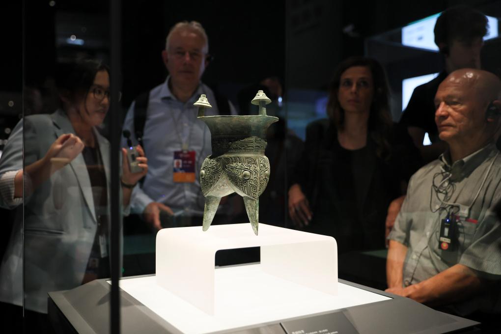 在上海博物館東館,學者們近距離感受中華文明的博大氣象?!拔疑羁腆w會到中國為守護自身文明所付出的巨大努力,這不僅令全世界的參觀者大開眼界,也啟發我們思考如何更好保護本國的文化遺產,守護人類共同的精神財富?!庇《葒H大學中國學院院長班納吉說。