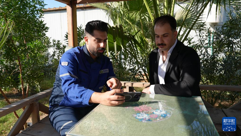 10月11日,首批振華石油獎學金項目留學生阿里·邁赫爾(左)在伊拉克東巴油田向即將赴華留學的邁赫迪·薩拉赫介紹自己的留學經歷。新華社記者 段敏夫 攝