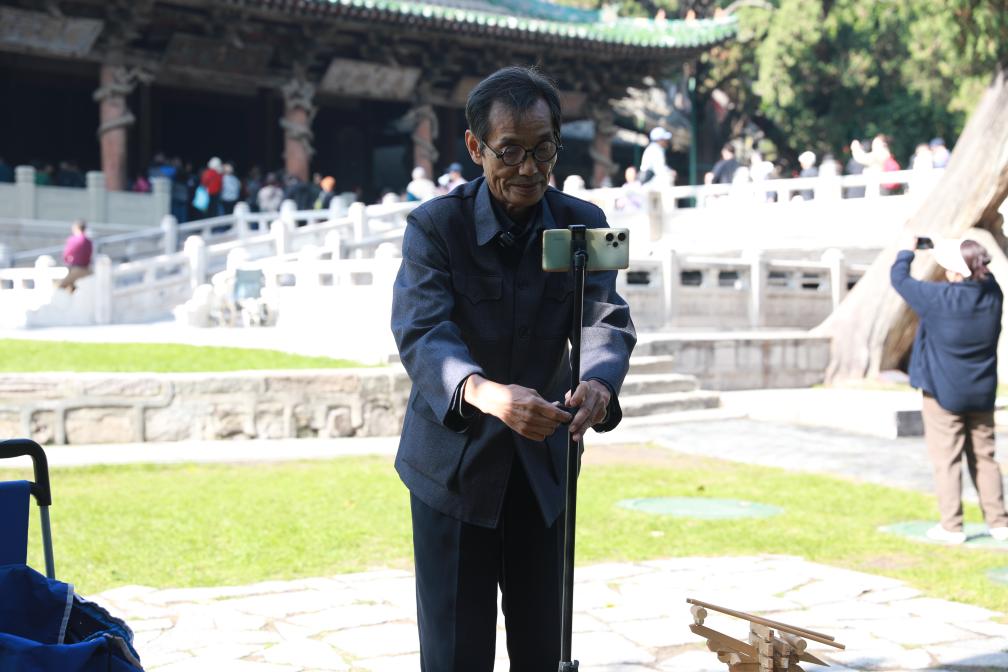 新華社太原10月29日電(記者張哲)午后的陽光穿過太原晉祠博物館的古槐枝葉,在圣母殿前灑下斑駁光影。75歲的王永先拎著裝滿斗拱模型和手繪圖的工具箱,拉著小推車慢慢走近。他熟練地撐開手機支架,調整好角度,從箱子里取出一個1/15比例的圣母殿斗拱模型,對著鏡頭輕輕頷首:“大家好,我是古建筑斗拱學堂的王老師,今天咱們聊聊這座宋代古建筑?!?/p>