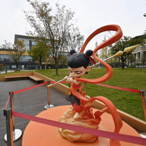 11月2日,市民從成都天府長島數字文創園的哪吒形象雕塑旁走過。新華社記者肖瀟 攝