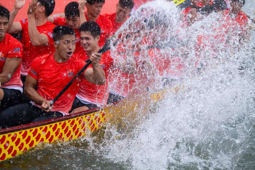 在香港仔海濱公園舉行的龍舟競渡大賽中,參賽選手奮楫爭先(2023年6月22日攝)。