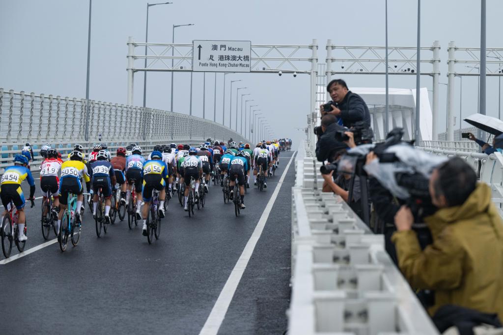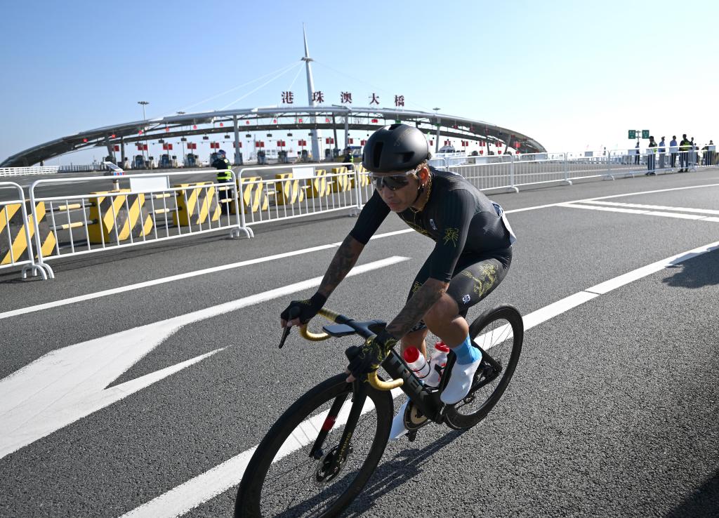 2024年11月24日,2024粵港澳公路自行車賽暨第十五屆全國運動會公路自行車測試賽舉行,圖為參賽選手在澳門大橋騎行。新華社記者 張金加 攝