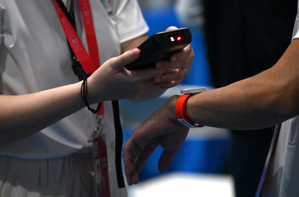11月8日,志愿者為參賽選手佩戴通關手環。新華社記者 張晨霖 攝