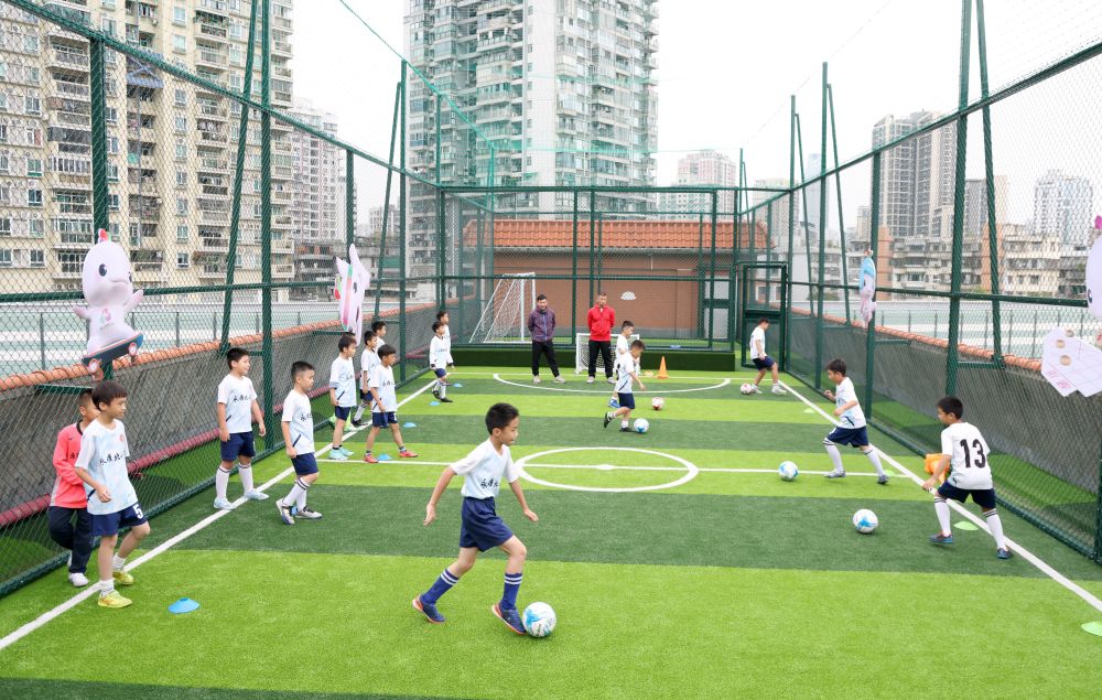 11月3日,廣州市永曜北小學的學生在學校樓頂天臺的足球場踢球。近年來,廣州市越秀區通過盤活橋下空間、屋頂平臺及街旁閑置地等城市的"金角銀邊",拓展老城區運動空間,激發全民健身活力。新華社記者 盧漢欣 攝